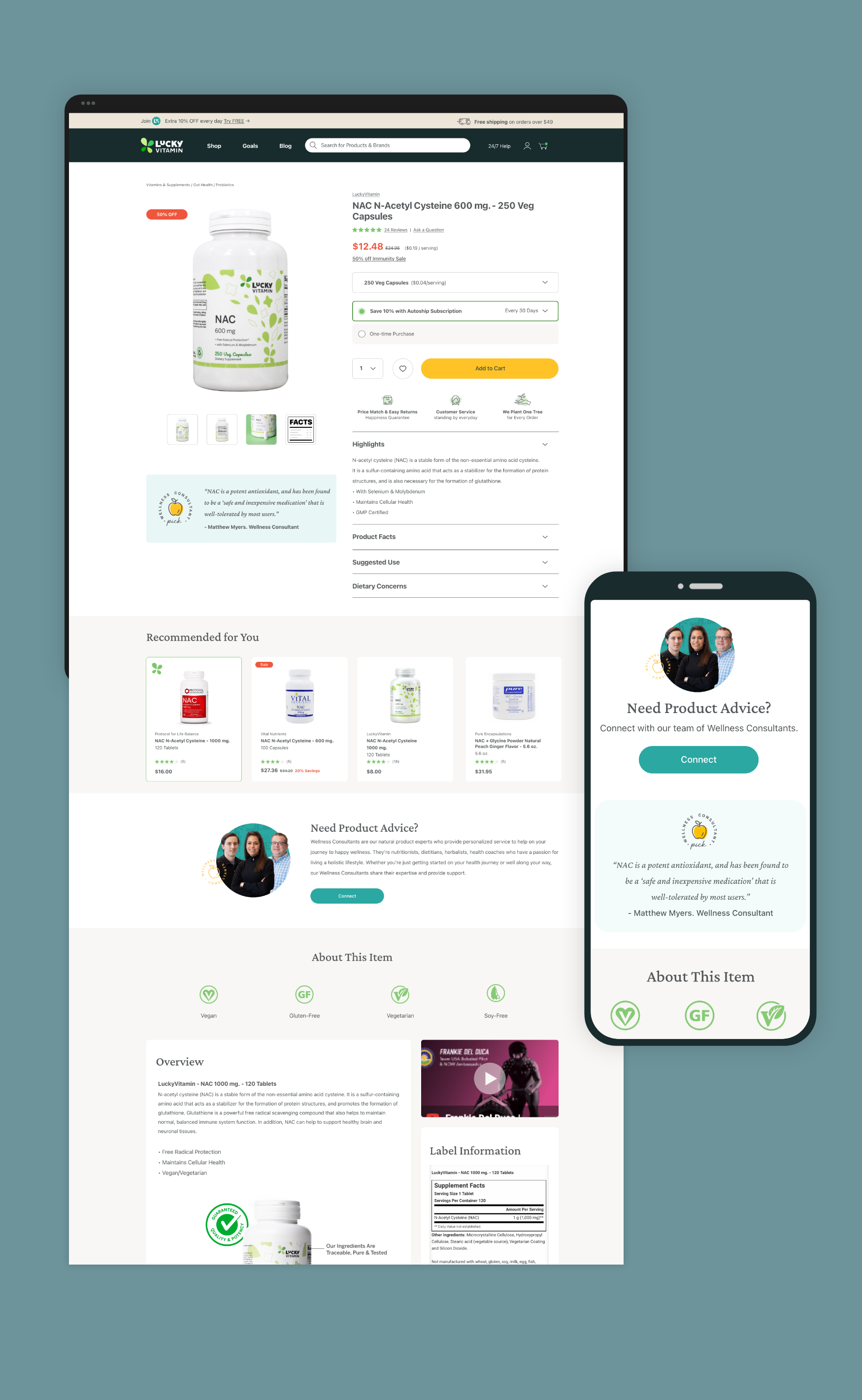 The product description page was arguably one of the most important pages on LuckyVitamin's site. Most customers came to our site through ads, emails or social media, linking them directly to a product page rather than the homepage, so tackling this page was crucial.