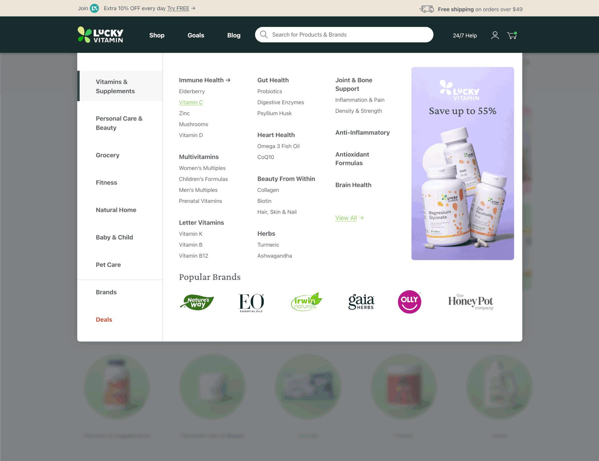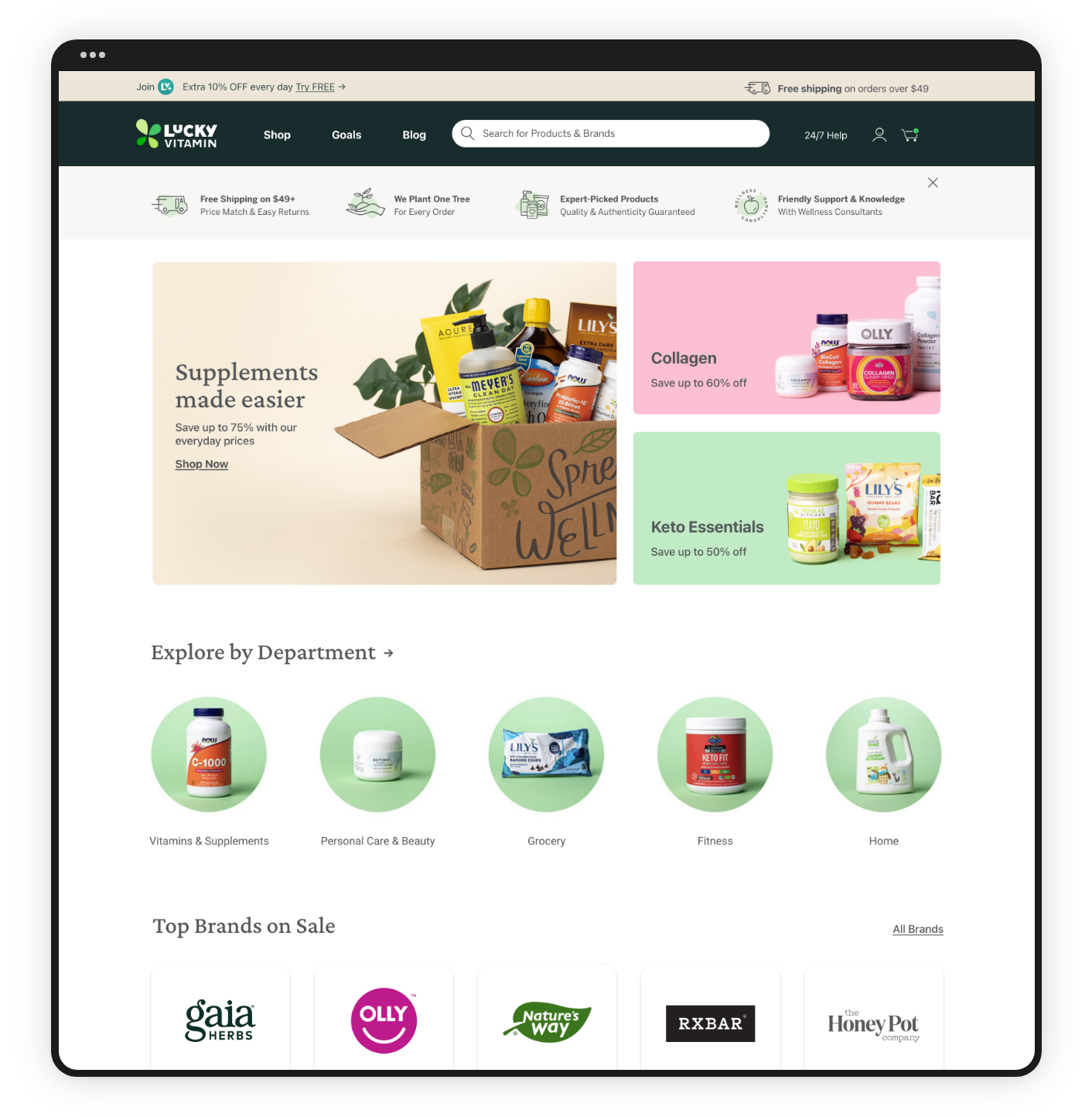Upon user research and testing, we found that these new homepage updates resulted in a 10% lift in conversion rates, by improving search capabilities, removing repetitive deals and promotional banners, and displaying LuckyVitamin's value proposition in a prominent space on the homepage.